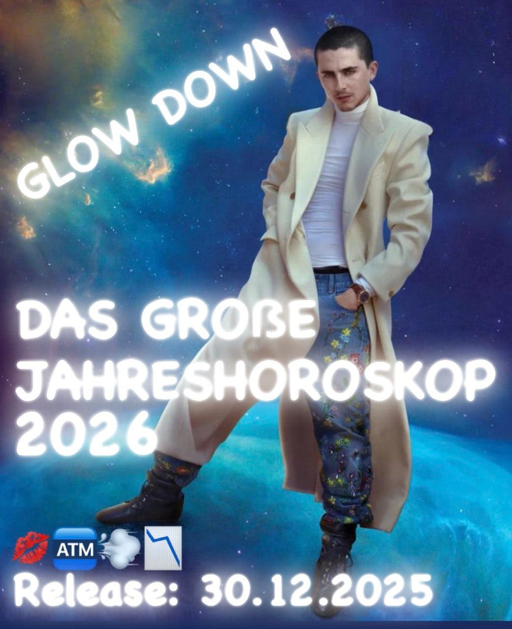 und willkommen zurück zu GLOW DOWN. Zeit für eine Jahresbilanz inkl. Follow-Ups. 2025 begann so: Timothée Chalamet fegte mit einem Lime Scooter über den roten Teppich und hat trotzdem keinen Oscar gewonnen (der Beginn einer Promo-Profilneurose) und wir verkündeten das Comeback von Charlotte Roche – der wir nach genauerer Analyse ihrer IG Videos leider eine Miranda-July-Psychose diagnostizieren.